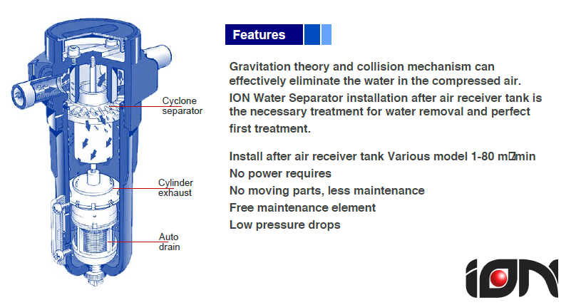 Dipasang setelah air receiver tank, menjadi air treatment pertama sebelum masuk ke air dryer. Membuang 70% kondensat di air tank.