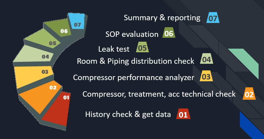 Technical check, Compressor performance analyzer, Energy audit, Leak test